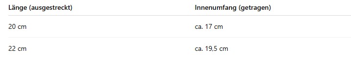 Die Längenangaben im Shop beziehen sich auf das Armband, wenn es ausgestreckt auf einer geraden Unterlage liegt. Zusätzlich wird der Innenumfang angegeben, den das Armband hat, wenn es am Handgelenk getragen wird.