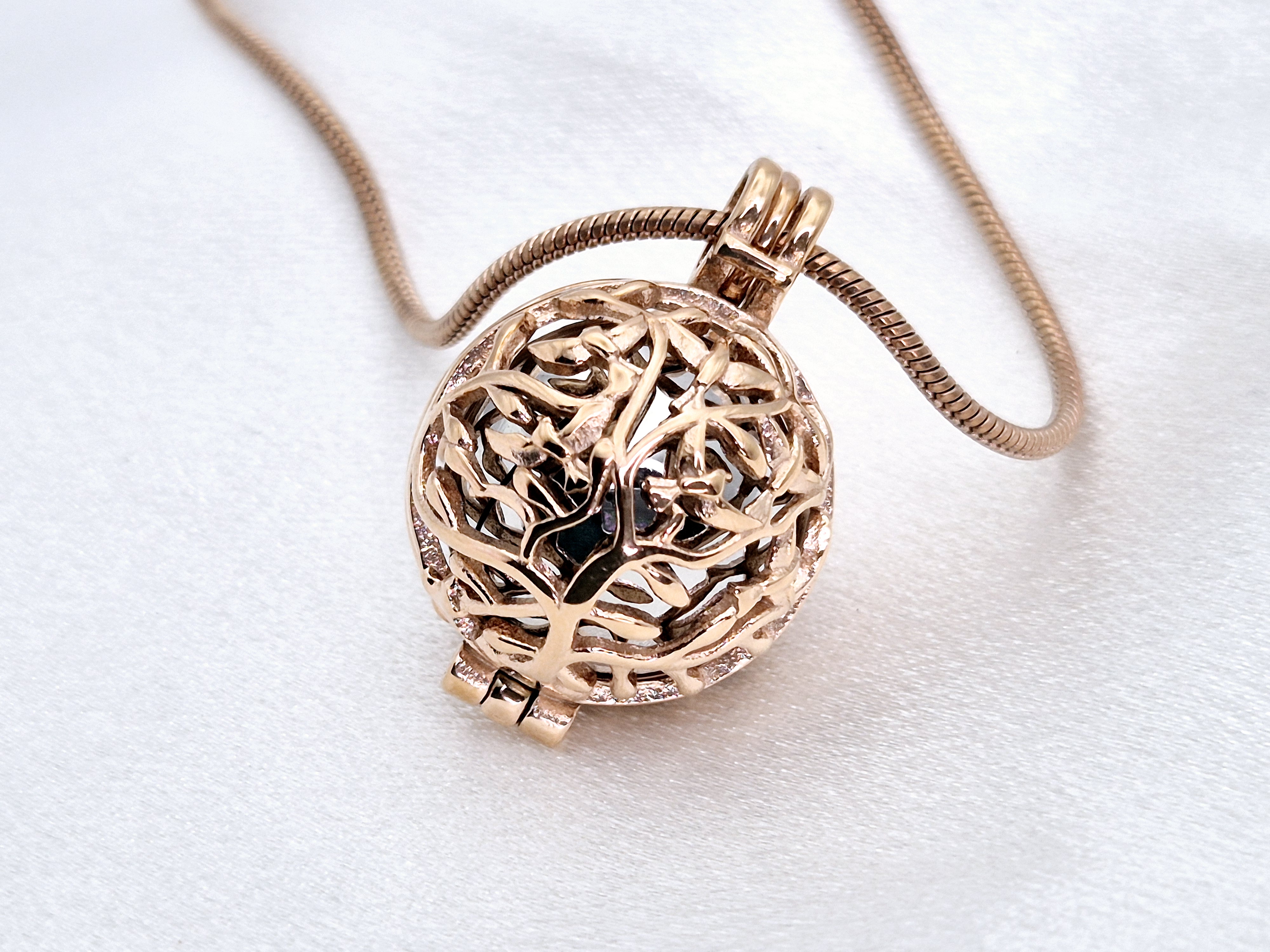 Dieser Asche Anhänger in Kugelform mit dem Motiv des Baum des Lebens ist ein edles Schmuckstück voller Symbolik. Die durchbrochene Aussenhülle zeigt den filigranen Baum des Lebens, dessen Äste und Wurzeln das Leben und die Verbindung zur Ewigkeit symbolisieren. Durch das Muster ist die innere, glänzende Silberkapsel sichtbar, die sicher im Zentrum ruht. Diese Kapsel kann mit Asche oder kleinen Erinnerungsstücken befüllt werden und macht den Anhänger zu einem persönlichen und bedeutungsvollen Andenken.
