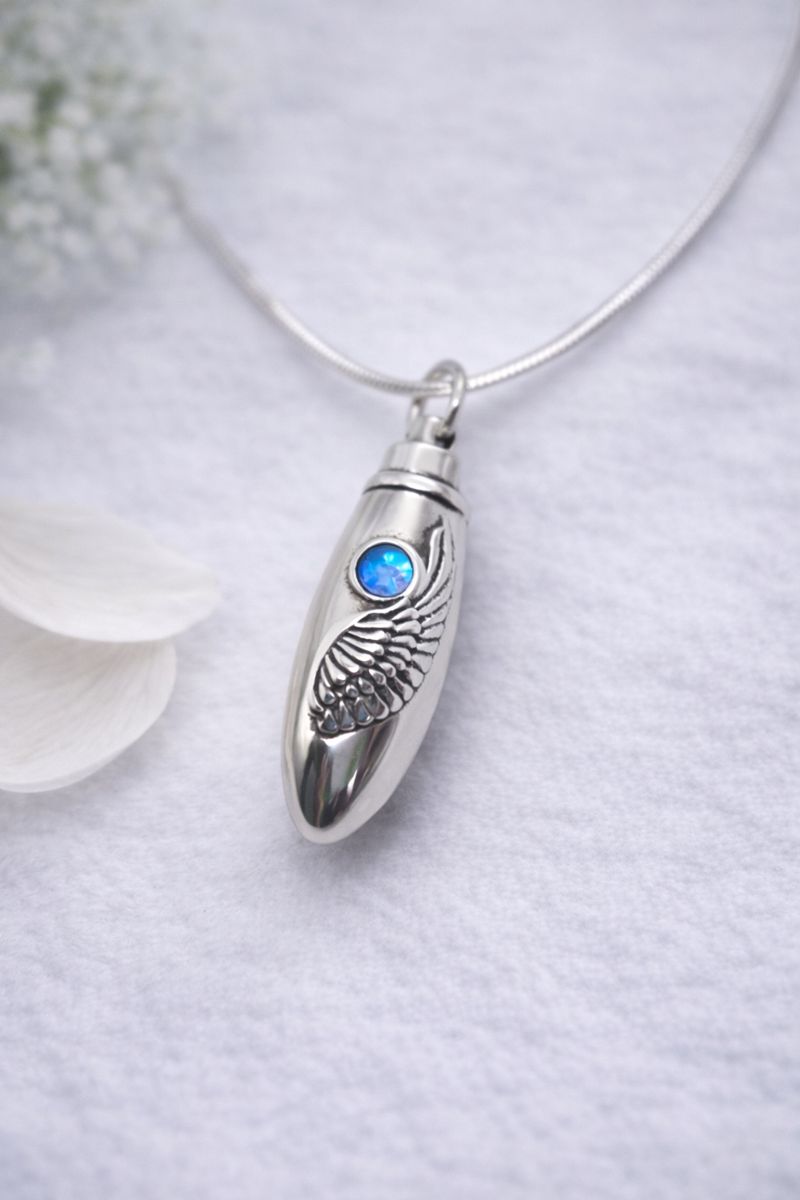 Ein zauberhafter Ascheschmuck Anhänger aus 925er Sterling Silber in ovaler Form, der einen Engelsflügel ziert. In der Mitte des Anhängers befindet sich ein funkelnder runder Kristall, der je nach Lichteinfall in verschiedenen Farben schimmert und glänzt. Dieser elegante Anhänger dient nicht nur als Erinnerungssymbol, sondern strahlt auch eine zeitlose Schönheit aus, die ihn zu einem besonderen und persönlichen Schmuckstück macht.