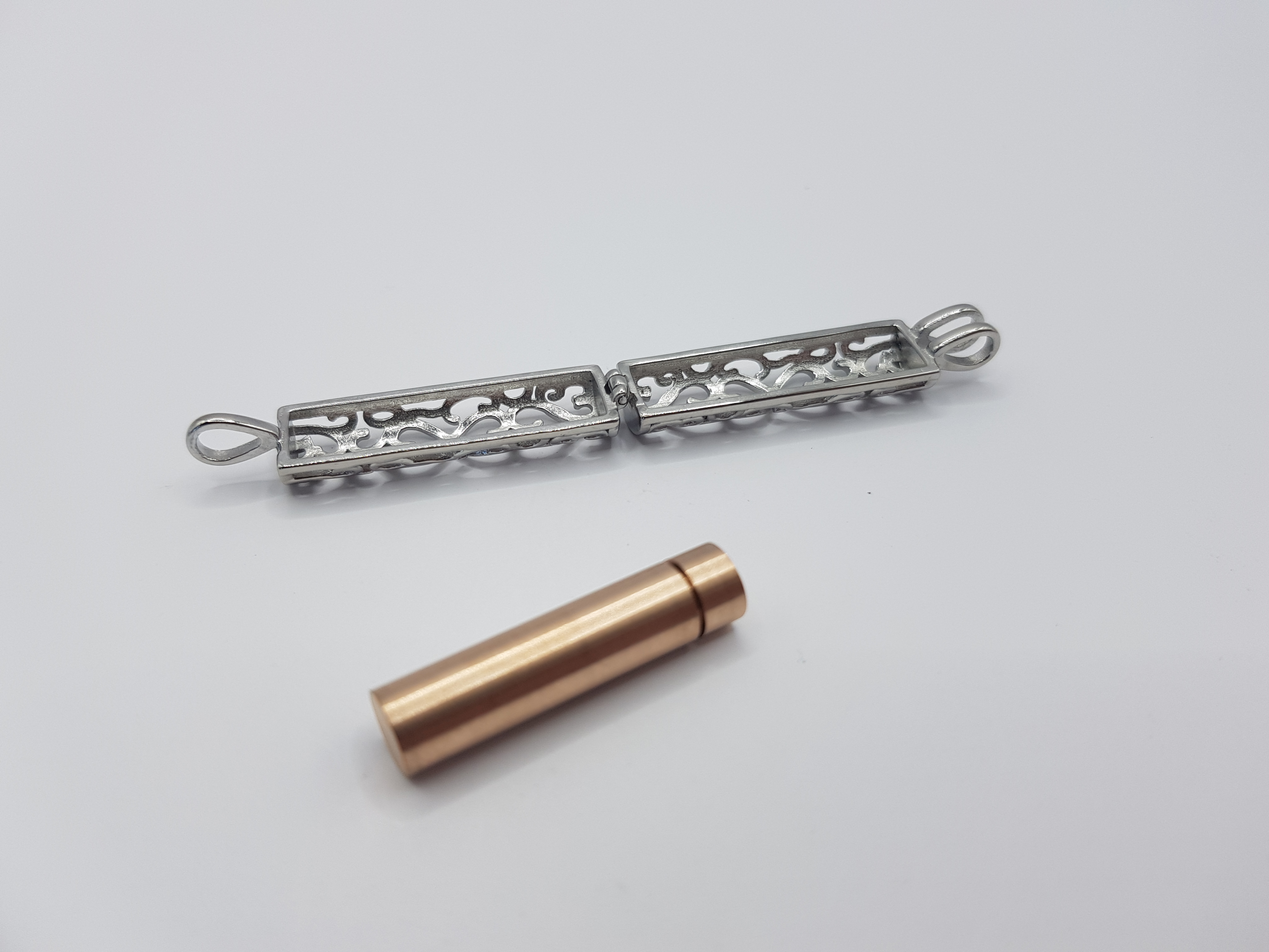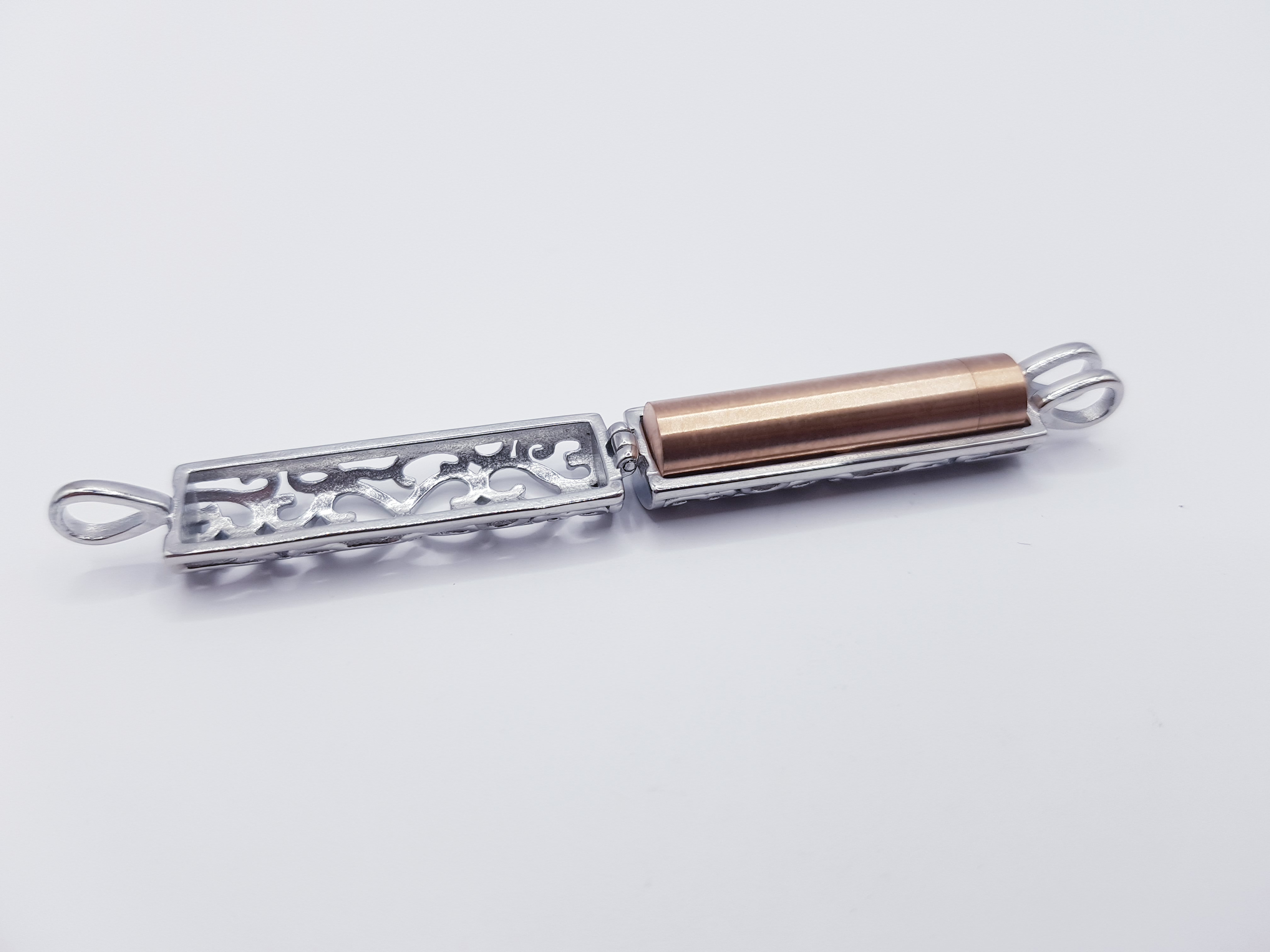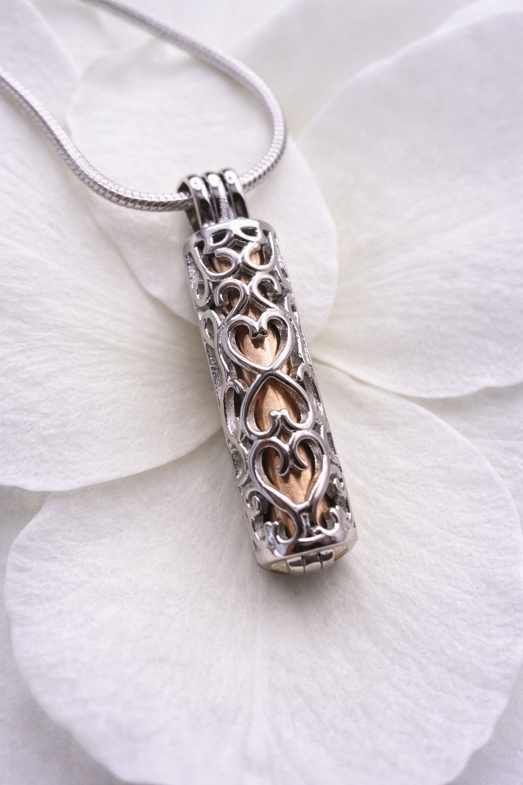 Das Gehäuse besteht aus hochwertigem Edelstahl und ist mit filigranen, ausgestanzten Herzen verziert. Im Ascheschmuck Anhänger befindet sich eine rose-goldene oder goldene Kapsel, die sich öffnen lässt. Diese Kapsel dient dazu, eine kleine Menge Asche und Haare eines geliebten Menschen oder Haustiers aufzunehmen. Dieses einzigartige Schmuckstück ermöglicht es, die Erinnerung an einen besonderen Menschen oder ein geliebtes Tier auf elegante und diskrete Weise in Form eines Schmuckstücks bei sich zu tragen.