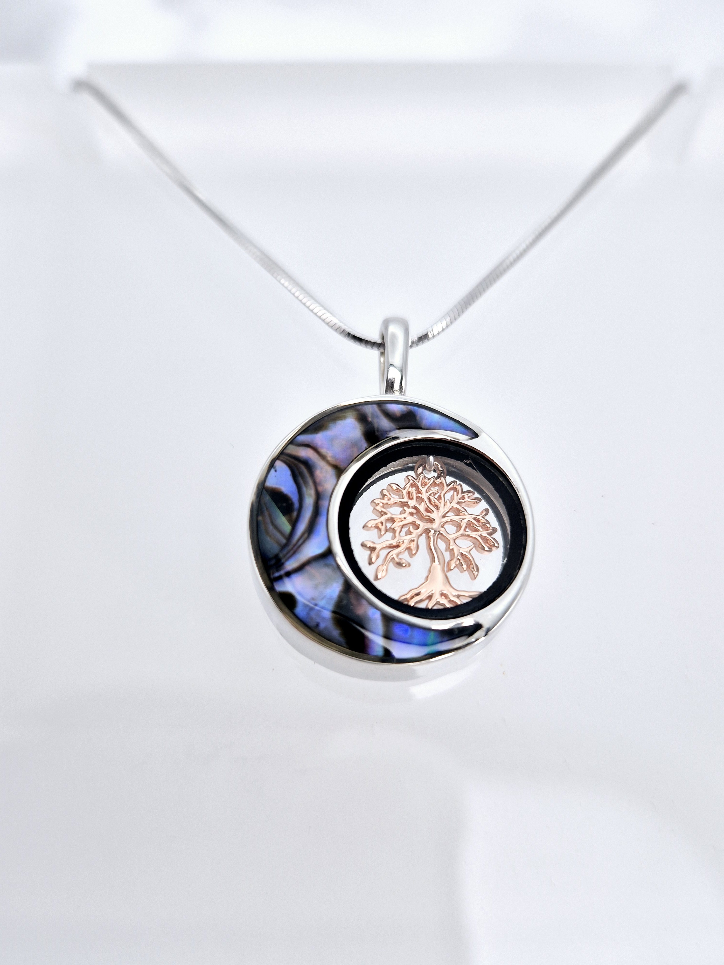 Seine linke Seite ziert ein schimmernder Halbmond aus Abalone-Muschel, dessen changierende Blau-, Grün- und Violetttöne je nach Lichteinfall unterschiedlich leuchten. Dieser Mond umschliesst ein filigranes Fenster, das wahlweise mit einem rosegoldenen Baum des Lebens oder einer Pfote verziert ist.