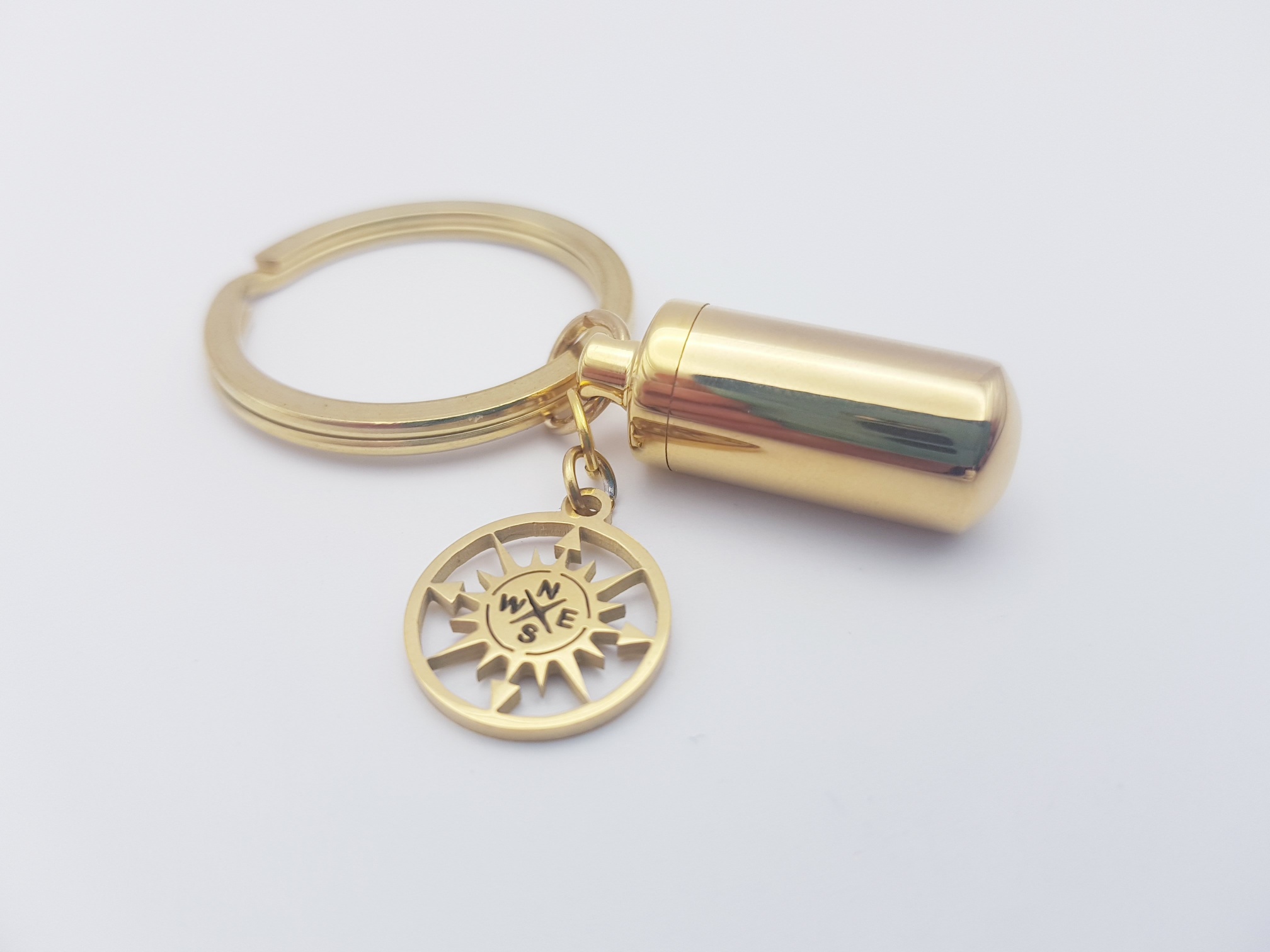 Der Ascheschmuck an diesem Schlüsselanhänger besteht aus einer zylinderförmigen Aschekapsel in Gold, die an einem charmanten Anhänger befestigt ist. Der Charm Anhänger kann entweder ein Engelsflügel oder ein Kompass sein und hängt an der Aschekapsel, um dem Schlüsselanhänger eine persönliche Note zu verleihen. In der Aschekapsel kann Asche und kleine Erinnerungsgegenstände von einem geliebten Menschen oder Tier aufbewahrt werden, damit man ihn oder sie immer bei sich tragen kann.