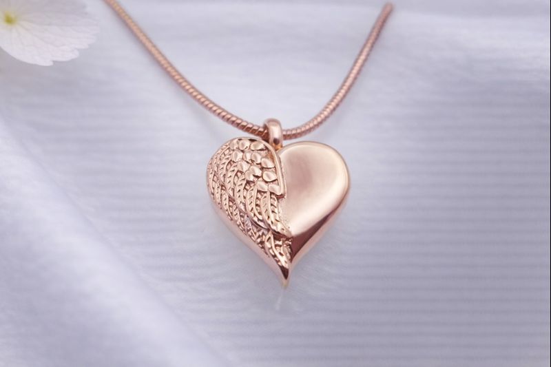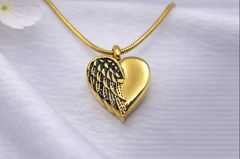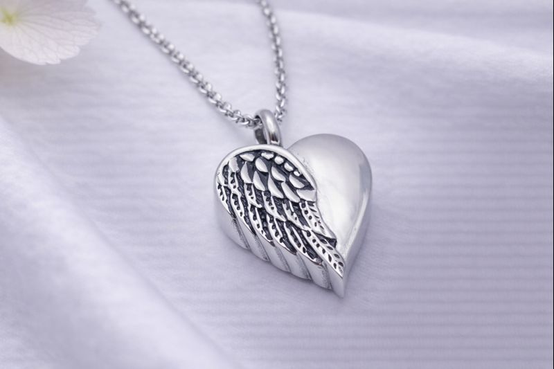 Dieser Asche Anhänger, in der Form eines Herzens gestaltet, symbolisiert Liebe und Verbundenheit. Auf der linken Seite des Herzens sind filigrane Engelsflügel angebracht, die Schutz und spirituelle Bedeutung verkörpern.
