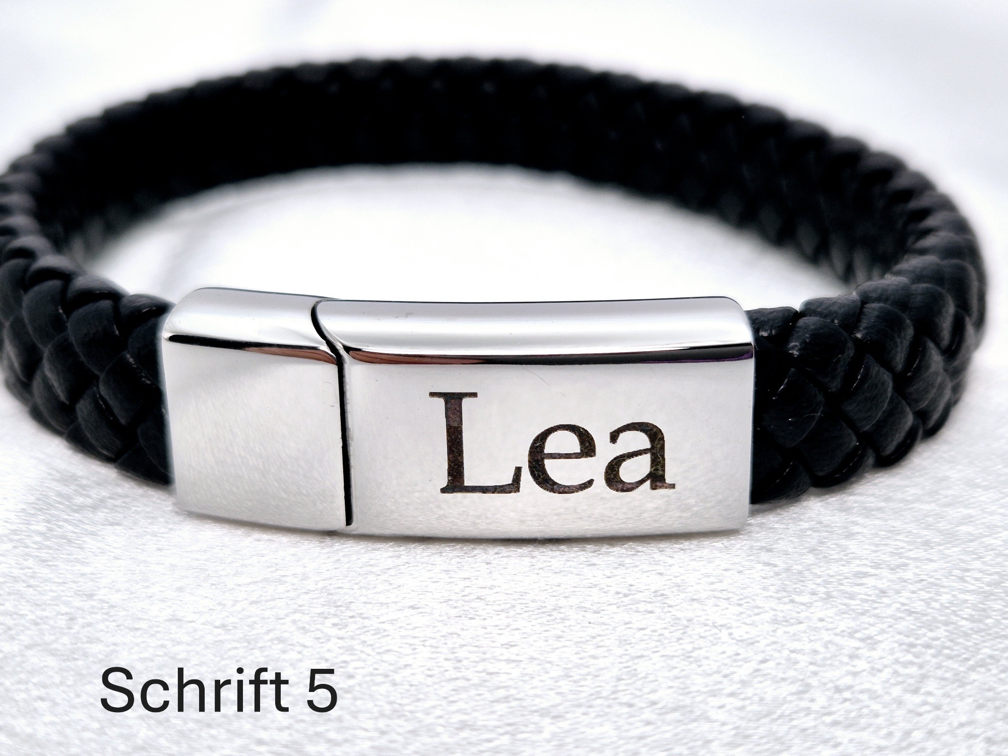 Gravur Service: Machen Sie Ihr Schmuckstück zu etwas ganz Besonderem! Wählen Sie aus sechs verschiedenen Schriftarten und lassen Sie einen Namen auf der Vorderseite des Verschlusses gravieren. Falls Sie sich unsicher bei der Grösse des Armbandes sind, biete ich Ihne die Möglichkeit, das Armband zuerst anzuprobieren und erst danach die Gravur machen zu lassen. Wenn Sie das wünsche bitte ich Sie, beim Zahlungsvorgang unter «Bemerkungen» dies zu vermerken.