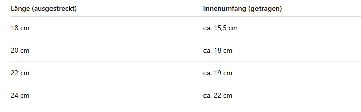 Die Längenangaben im Shop beziehen sich auf das Armband, wenn es ausgestreckt auf einer geraden Unterlage liegt. Zusätzlich wird der Innenumfang angegeben, den das Armband hat, wenn es am Handgelenk getragen wird.