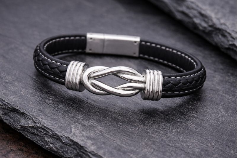 Das Ascheschmuck Armband besteht aus dunkelbraunem oder schwarzem Leder mit einer kunstvollen Flechtstruktur. Diese Struktur verleiht dem Armband eine rustikale und dennoch elegante Ästhetik. Das zentrale Element dieses Armbands ist der Edelstahleinsatz in Form eines Knotens. Dieser Knoten symbolisiert die Verbindung zu den Erinnerungen und die ewige Bindung an diejenigen, die uns wichtig sind. Der raffinierte Verschluss des Armbands ist gleichzeitig der Behälter für die Asche.