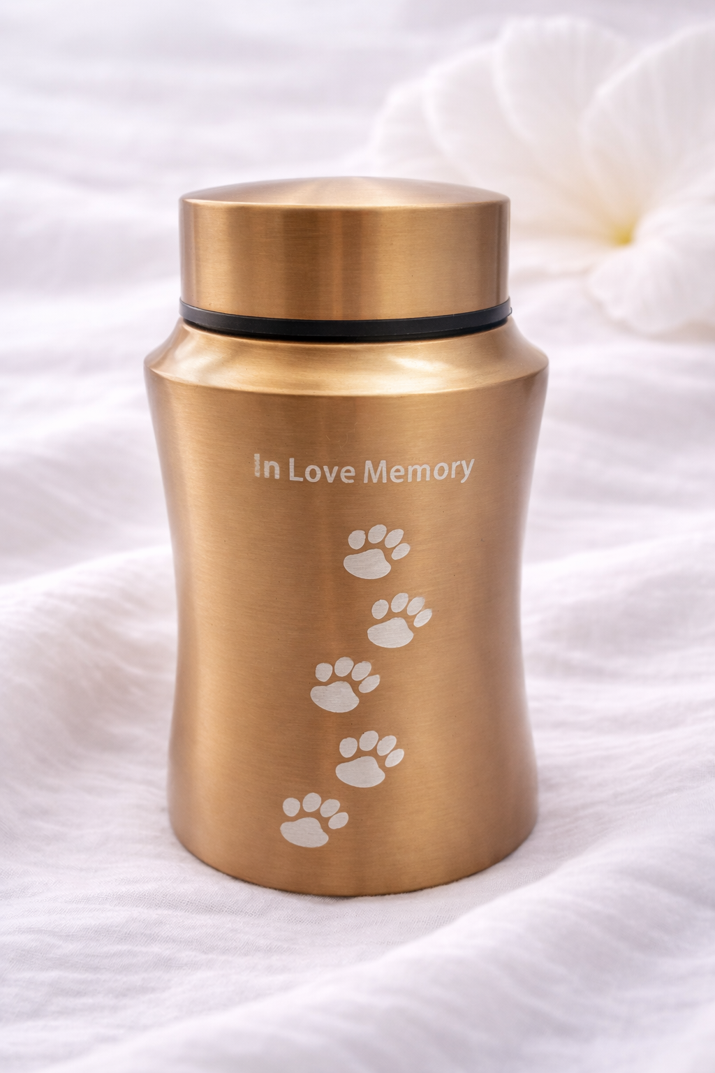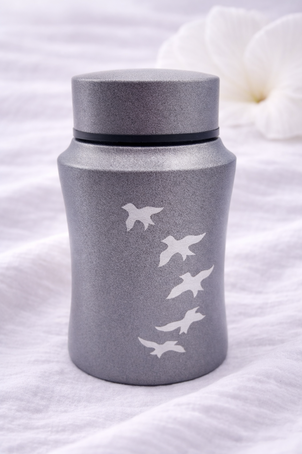 Diese Urne aus Edelstahl ist ein hochwertiges Behältnis, welches mit Motiven wie Pfotenabdrücken oder Vögeln verziert ist. Diese Urne dient zur Aufbewahrung der Asche eines geliebten Haustieres und bietet die Möglichkeit, einen besonderen Gedenkort zu schaffen.