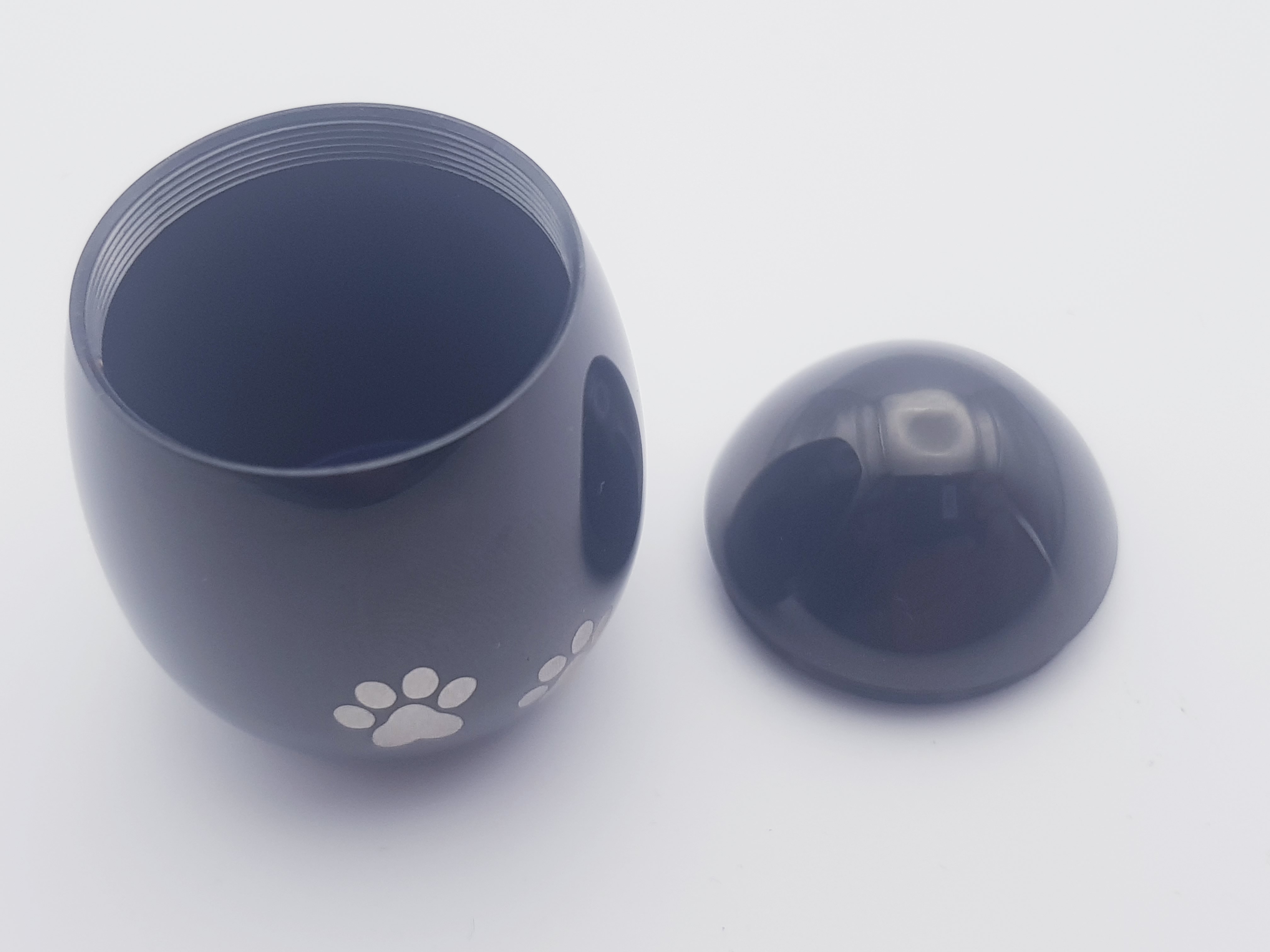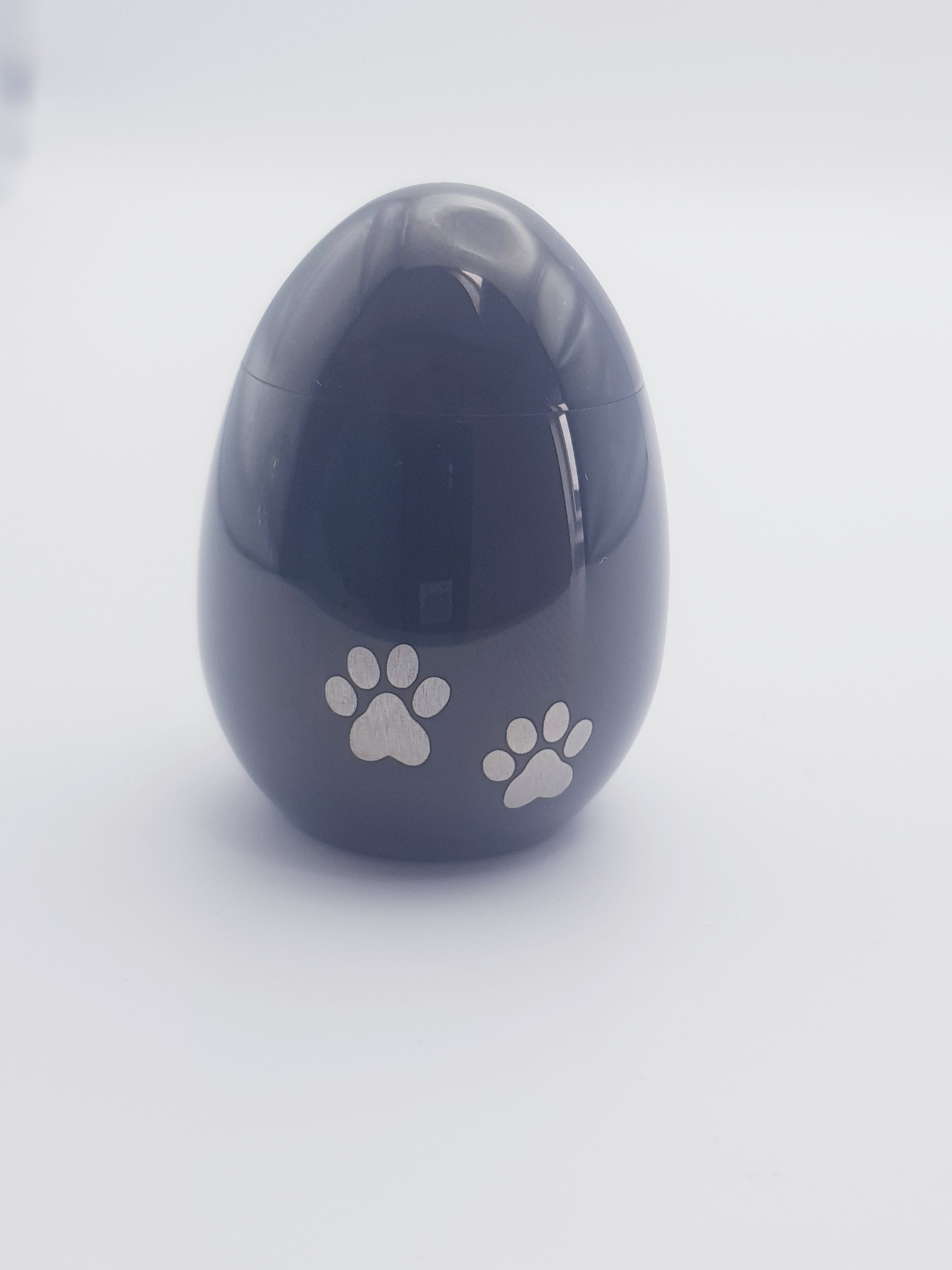 Die kleine schwarze Edelstahlurne ist schlicht und elegant gestaltet. Auf ihrer Oberfläche befinden sich zwei Pfotenabdrücke, die in Silber gehalten sind. Diese zarten Pfotenabdrücke verleihen der Urne eine liebevolle und persönliche Note, ideal für die Erinnerung an ein geliebtes Haustier.
