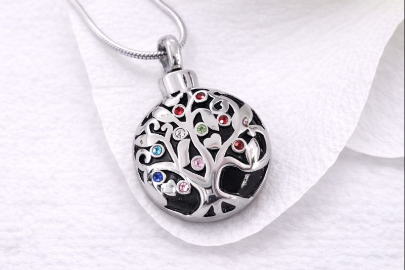 Auf dem Asche Anhänger befindet sich ein reliefartiges Motiv des Baums des Lebens. Der Baum des Lebens ist ein starkes Symbol für Wachstum, Verbindung und Kontinuität, und wird oft als Ausdruck der Unsterblichkeit verwendet. Die Äste und Wurzeln des Baums sind kunstvoll dargestellt und die Details sind mit farbigen Kristallen akzentuiert. Die Kristalle sind in verschiedenen Farben gehalten, um die Bedeutung und Symbolik des Baums zu unterstreichen. Zum Beispiel stehen die grünen Kristalle für Wachstum und Natur, während blaue Kristalle für Ruhe und Gelassenheit stehen.
