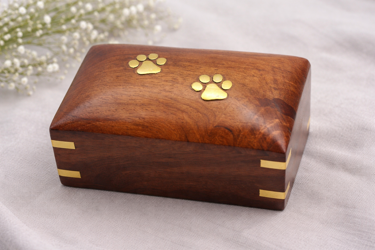 Schöne Holz Urne aus Sheesham Holz (Rosenholz). Dieses Holz hat eine tiefbraune Farbe und glänzt im Sonnenlicht goldbraun. Dunklere Streifen geben dem Holz ein attraktives Aussehen. Auf der Oberseite sind zwei Pfoten aus Messing eingelegt. Die Ecken der Urne sind mit Messing-Einlagen verziert.